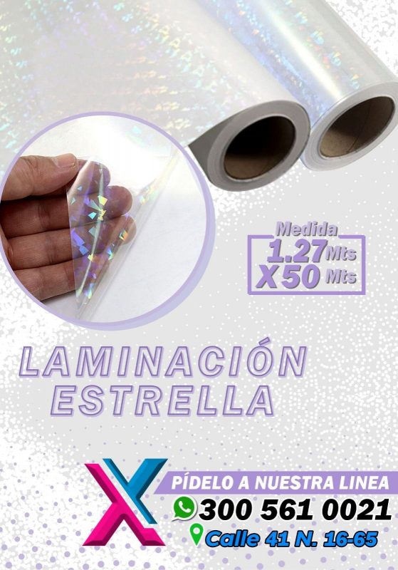 La laminación estrella es un material especial que aporta un acabado decorativo con efecto brillante en forma de pequeñas estrellas, ideal para realzar impresiones, vinilos y gráficos publicitarios. Este tipo de laminado no solo mejora la apariencia visual del diseño, sino que también agrega un toque creativo y llamativo que destaca en proyectos decorativos y promocionales.
