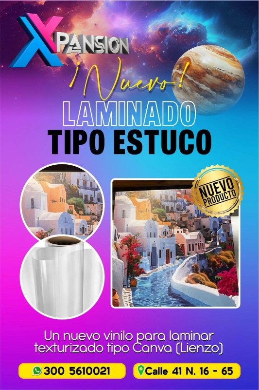 El laminado tipo estuco es un vinilo especial para laminación que ofrece un acabado texturizado tipo canvas (lienzo), ideal para dar un estilo artístico y elegante a impresiones y gráficos decorativos. Este tipo de laminado aporta profundidad y textura al diseño, creando un efecto visual similar al de una pintura sobre lienzo.