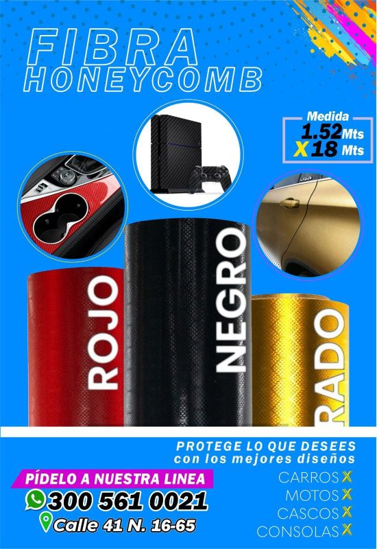 La fibra Honeycomb es un vinilo decorativo con textura tipo panal que ofrece un diseño moderno y deportivo, ideal para personalizar y proteger diferentes superficies. Su acabado llamativo aporta estilo y carácter, convirtiéndose en una excelente opción para proyectos de personalización.