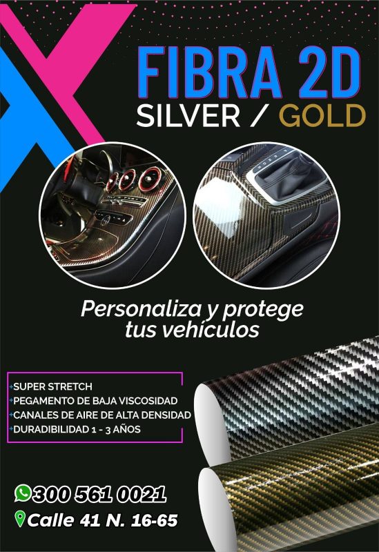 La fibra 2D es un vinilo decorativo diseñado para la personalización y protección de superficies, especialmente en aplicaciones automotrices. Su acabado moderno en Silver y Gold permite darle un estilo elegante y llamativo a vehículos y diferentes objetos, destacando por su apariencia profesional y resistente.