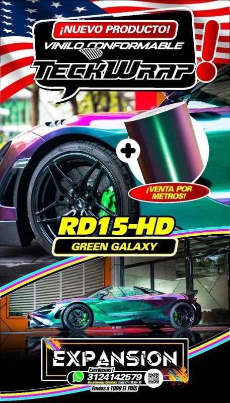 El vinilo conformable Teckwrap Green Galaxy (RD15-HD) es un material de alta calidad diseñado para personalización y decoración de superficies, especialmente en aplicaciones automotrices. Su acabado con efecto galaxy brillante ofrece un estilo moderno y llamativo, ideal para proyectos que buscan destacar con un diseño único.